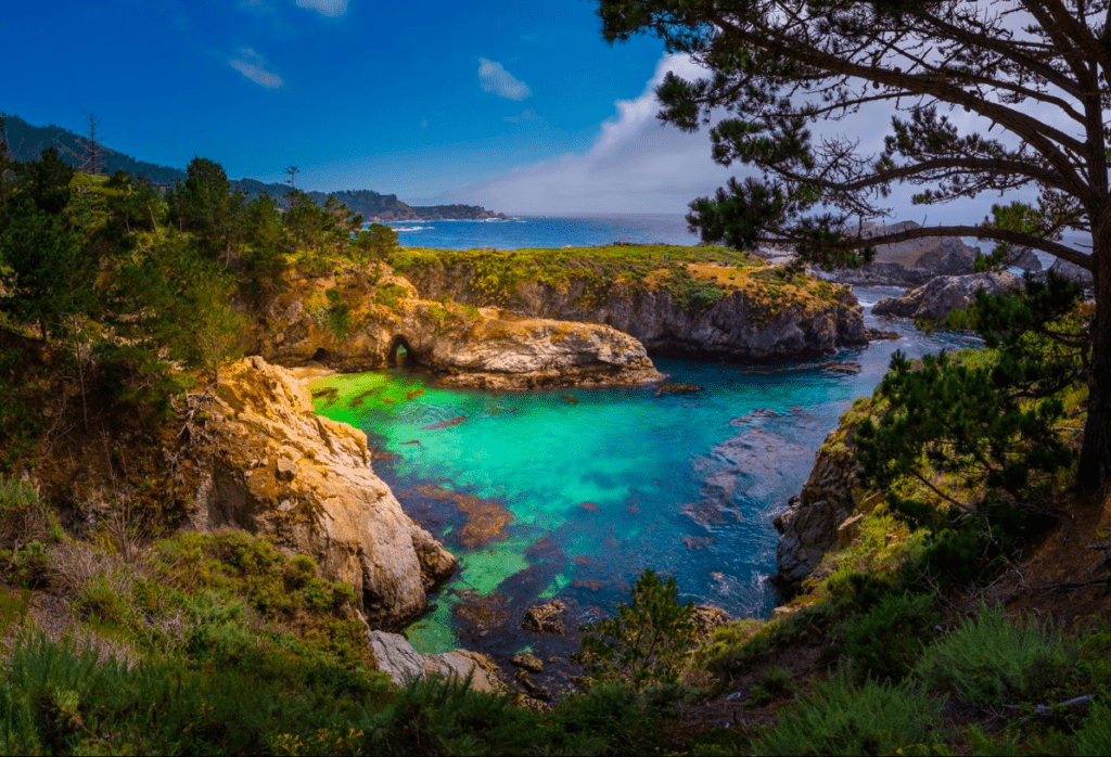 Árvores dançando com a força do vento, rochedos e um lindo mar azul que te acompanha durante toda a sua viagem por Big Sur. Trecho